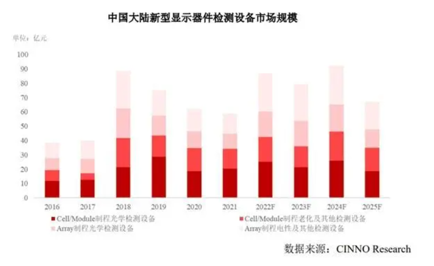 根据 CINNO Research 报告,2021 年中国大陆新型显示器件检测设备市场规模约为 59 亿元,其中 Cell/Module 制程检测设备约为 34 亿元。新的建厂和扩产将带动检测设备市场在 2024 年达到 92 亿元,其中 Cell/Module 制程检测设备市场规模在 2024 年将达到 46 亿元。